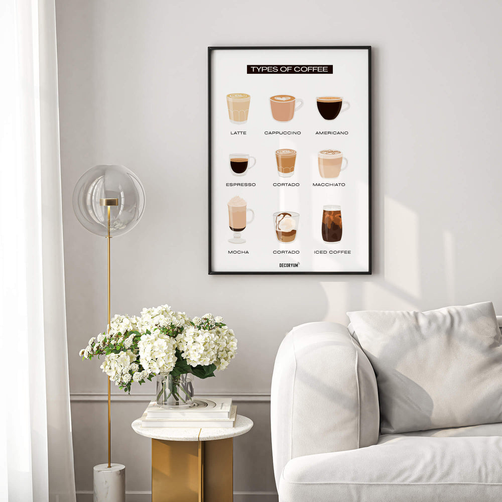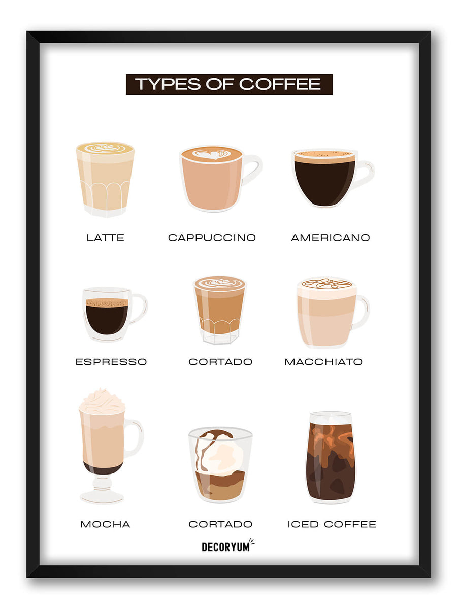 Celebrate the world of coffee with Types of Coffee 9, a visual tribute to nine timeless brews: Latte, Espresso, Mocha, Cortado, Iced Coffee, Macchiato, Cappuccino, Americano, and Flat White.